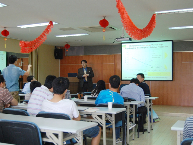 6月5日,杰克逊州立大学土木与环境工程系主任Farshad Amini教授应邀来到高清av ,在严恺馆702就海堤溢流溃堤、海堤坡面防护等方面的研究为高清av 师生做了一场学术报告。本次报告主要介绍了三种海堤背水坡的保护系统(碾压混凝土 Roller Compaction Concrete、铰接式护坡砖 Articulated Concrete Blocks、高性能加筋草皮 High Performance Turf Reinforcement Mat)溢流和波浪溢流的大型物理试验的研究成果。该试验是在美国俄勒冈州立大学的波浪研究实验室内进行的原物尺寸的水槽实验,消除了前人使用小尺度海堤引起的尺度效应。通过试验,对每一种海堤保护系统上发生溢流和波浪溢流时的详细水力学数据(包括流量、流速、水深、波浪特征等)给出了预测方法,对海堤保护系统表面的侵蚀特征做出了总结;并对三种海堤保护系统的水力学表现进行比较,给出了三种海堤保护系统的保护作用的评估。