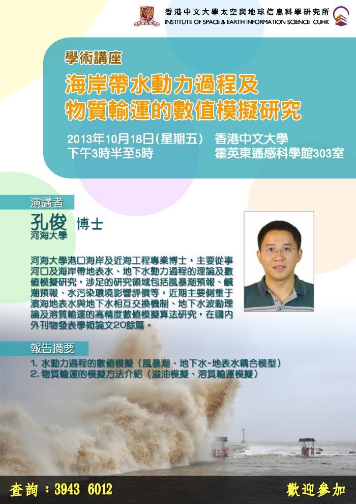 2013年10月18日,高清av 孔俊副教授应香港中文大学太空与地球信息科学研究所邀请,在香港中文大学开展学术讲座《海岸带水动力过程及物质输运的数值模拟研究》。孔俊副教授长期从事河口及海岸带地表水、地下水动力过程的理论及数值模拟研究,涉足的研究领域包括风暴潮预报、咸潮预报、水污染环境影响评价等,近年来侧重于滨海地表水与地下水相互交换机制、地下水波动理论及水体中污染物输运的高精度数值算法研究,在国内外刊物发表学术论文20余篇。本次讲座,孔俊副教授对其近年来提出的高精度物质输运模拟算法“A High-resolution method for the depth-integrated solute transport equation based on an unstructured mesh”和地表水—地下水整体模型“A new model for coupling surface and subsurface water flows: With an application to a lagoon” 进行了宣讲,并与中大科研人员就下阶段的合作进行了深入交流。
