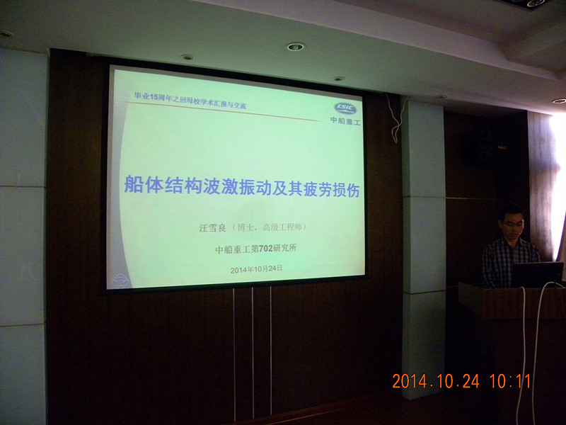 2014年10月24日上午,高清av 兼职教授汪雪良博士受聘仪式暨学术报告会在高清av 严恺馆502举行。授聘仪式由高清av 院长郑金海教授主持。高清av 副院长诸裕良教授主持了学术报告会,院长助理张继生教授及众多师生出席了仪式。仪式上,郑金海院长向汪雪良博士颁发了高清av 兼职教授聘书,学生代表为汪雪良博士佩戴校徽。仪式结束后,汪雪良博士做了题为“船体结构波激振动及其疲劳损伤”的报告,并与师生展开了热烈讨论。