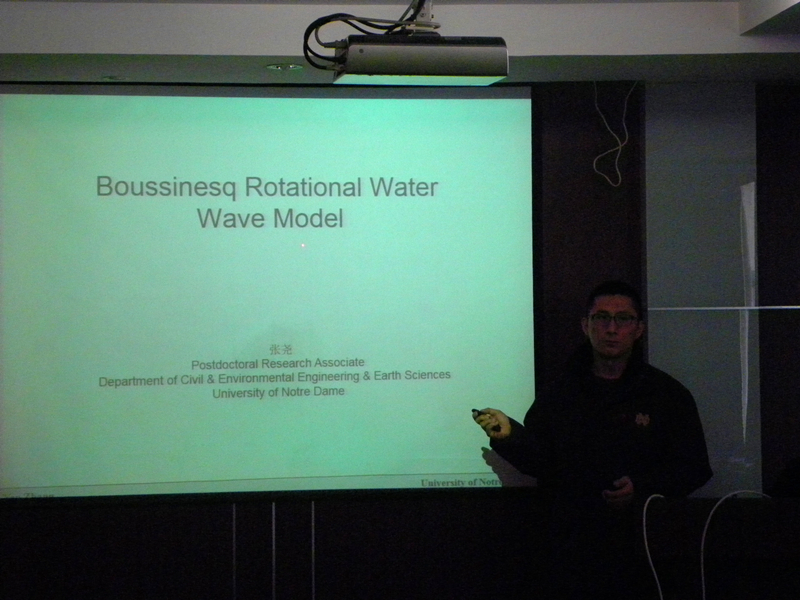 2014年12月12日上午,美国圣母大学土木与环境工程及地球科学系张尧博士来高清av 访问交流。张尧博士为高清av 师生作了题为“Boussinesq-Green-Naghdi rotational water wave model: theory and applications”的学术报告,详细阐述了其开发的Boussinesq-Green-Naghdi有旋水动力模型,并介绍了该模型在菲律宾沿海与美国新泽西州海岸灾害研究中的实际工程应用。报告后针对新模型与传统Boussinesq模型的改进程度及其在模拟水波有旋运动上的优势等问题,张尧博士与高清av 师生进行了热烈的讨论。