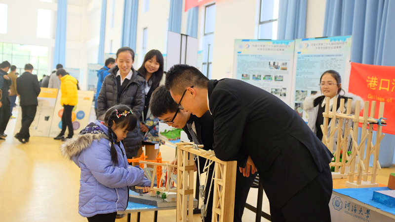 科协的布展情况。获得“第四届全国水利创新设计大赛”特等奖的“一种GPS定位的波浪能动力船”吸引了领导们的目光。这项发明的作者从灵感来源、设计理念、原理方法和实施过程四个方面向现场人员介绍了他进行发明过程中的困难和收获,获得了在场人员的好评。学院学生院科协的工作人员也重点对学院科技节品牌活动——水工模型进行了介绍,向在场人员展示了获奖作品。郭书记一行对科技节布展作品所展现出的的大胆创新的想法和付诸实践的能力表示了赞赏,也对参加布展工作的同学们表示了感谢。下午三点,闭幕展落下帷幕,港航学子会将在科技节期间所展现的科技创新的精神和能力带到平时的学习和科研中去,努力提高自己将专业知识服务于创新的能力,争做新时代科技创新的先行者。