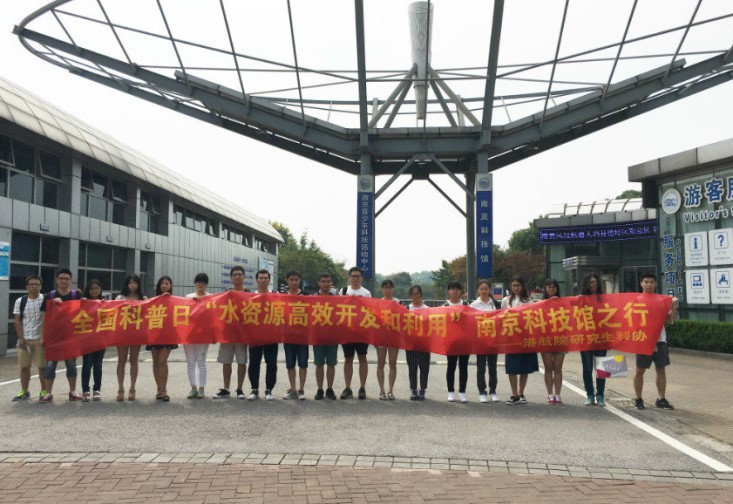 上午十时许,同学们抵达了目的地,开始了参观活动。由于有不少研一新同学,因此大家普遍对与水利工程相关的展品表现出更大的兴致。在重力坝模型前,同学们第一次通过实物认识到大坝的各部分结构,如坝体,船闸,泄洪闸等,与以往仅仅在书本上获取理论知识不同,通过参观模型,大家对于一些常见水利工程的认识有了质的飞跃;而在漩涡生成机处,同学们通过实验,充分了解了漩涡这种海洋工程中常见的现象,是如何产生并造成危害的。在港口以及海岸的工程应用中,漩涡一直是研究的热点问题之一,这种零距离接触对于同学们的学术研究也必定大有裨益。随后大家还参观了一些与水处理工艺相关的展品,并通过相关的指引牌掌握了整个流程的基本要点。参观活动中,大家还主动去了解一些跨学科的知识,如化学,生物等,体验了地震展馆等基础性学科展馆,这也充分体现了学院对于研究生培养工作的精神,即注重专业,全面发展。参观结束后,全体同学在科技馆外合影留念。