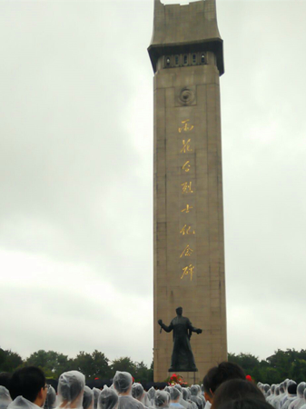 清晨,天空中下着雨,各界爱国人士齐聚雨花台,为雨花台烈士纪念碑献花。阴沉的天空使雨花台更显的庄严肃穆,武警官兵方阵,高校学生代表方阵,少先队员方阵整齐排列,等待活动的开始。