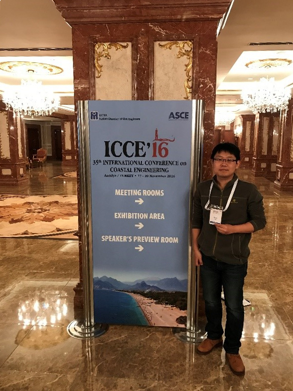 2016年11月17日至22日,高清av 隋倜倜博士参加了在土耳其安塔利亚召开的第35届海岸工程国际会议(International Conference on Coastal Engineering)。隋倜倜博士做了题为“Effects of Pile Displacement on its Surrounding Seabed Response Under 3D Wave Loading”的报告,介绍了自己最新的研究成果,并与国际同行开展广泛交流。