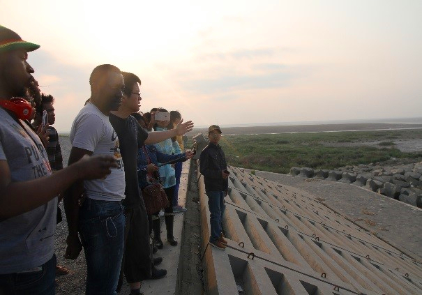 2017年5月20-21日,陈永平教授、周曾副研究员、康彦彦老师、许春阳老师带领16名留学生与6名课题组研究生赴江苏沿海开展现场教学活动。此次活动为我校留学生精品课程《Estuarine and Coastal Dynamics》和《Advanced Coastal Dynamics》的重要教学环节,教学地点位于东台市弶港条子泥围垦区和大丰市斗龙港淤泥质潮滩。途中,陈永平教授等带领大家参观了条子泥围垦区、西大港潮滩、梁垛河水闸和斗龙港米草滩等地,向同学们悉心介绍了条子泥围垦工程的背景与现状、垦区盐碱地脱盐改造技术、潮滩盐沼植被的扩展与蚀退规律、潮沟的形成演变及湿地保护等方面的内容,使同学们对淤泥质潮滩的地形地貌演变与开发利用有了更为直观和感性的认识,加深了大家对淤泥质潮滩及潮沟演变规律、潮汐与水沙运动特性的理解,取得了良好的教学效果。此外,此次教学活动促进了中外学生及师生之间的沟通交流,在学习之余锻炼了大家的语言表达和交际能力,使大家受益良多。