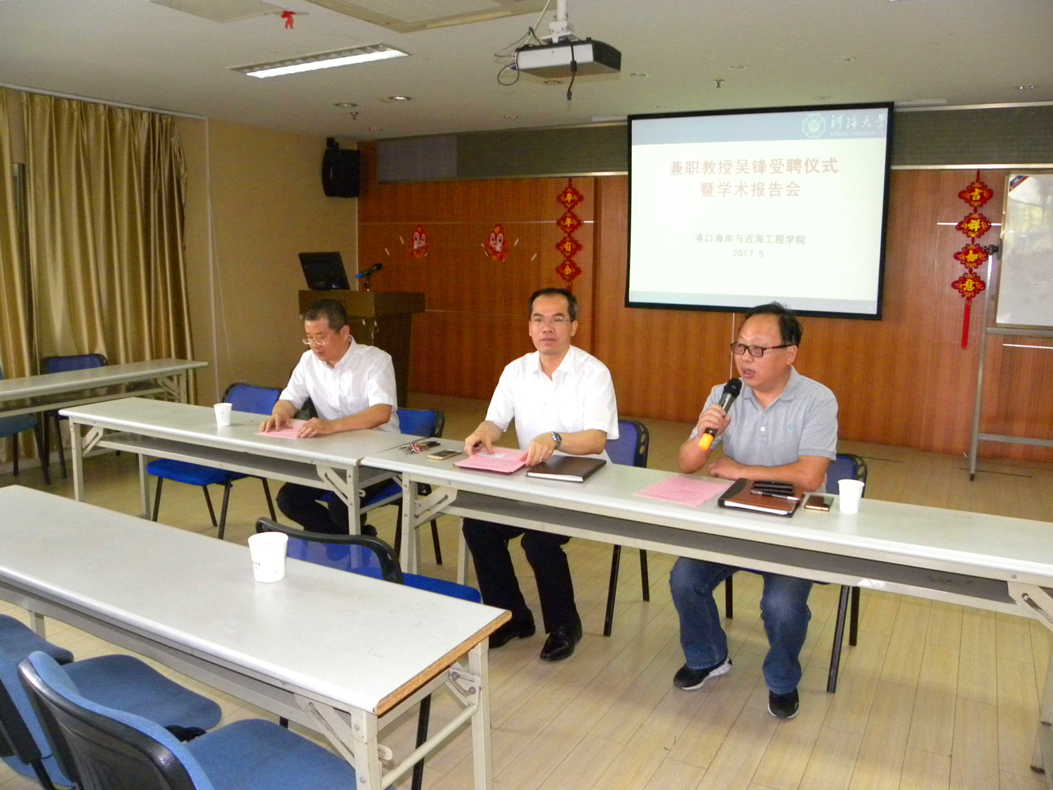 2017年5月26日,中交上海三航科学研究院有限公司副总经理兼总工程师吴锋兼职教授聘任仪式在高清av 举行,郑金海院长为吴教授颁发了聘任证书。随后吴锋教授为高清av 师生作了题为:“海上风电基础结构检测评估与维护技术”的学术报告,介绍了他所带领的团队在海上风电基础结构检测评估、运营监控以及防腐维护领域的新技术与新思想,并与参会师生进行了深入讨论与交流。