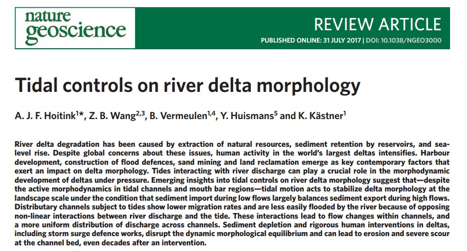 近期,高清av 张蔚教授和周曾副研究员的学术研究成果被国际顶尖学术期刊Nature旗下子刊Nature Geoscience(影响因子13.941)上发表的论文“Tidal controls on river delta morphology”引用。该论文回顾了近年来在三角洲地貌演变研究领域起主要推动作用的研究成果,其中多出引用了张蔚教授发表在《Geomorphology》上的论文“Long-term change in tidal dynamics and its cause in the Pearl River Delta, China”和发表在《Marine Geology》上的论文“Morphological change in the Pearl River Delta, China”, 以及周曾副研究员发表在《Earth-science Reviews》上的论文“Is morphodynamic equilibrium an oxymoron?”和发表在《Journal of Geophysical Research》上的论文“A comparative study of physical and numerical modeling of tidal network ontogeny”。