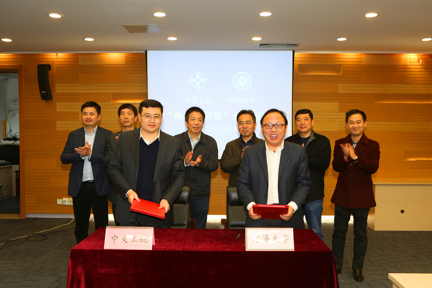 12月2日,中交上海航道局有限公司与我校在闻天馆203举行“岗前培训班”开班仪式。高清av 党委副书记郭继超、中交上海航道局有限公司副总经理曹湘喜出席仪式并致辞,高清av 党委书记胡忠华与中交上海航道局有限公司人力资源部副总经理万帮建分别代表双方签订了培训合作协议。中交上海航道局有限公司相关部门、子公司负责人,高清av 相关部门、学院负责人和培训班学员参加了开班仪式,高清av 副院长张继生主持会议。