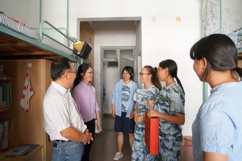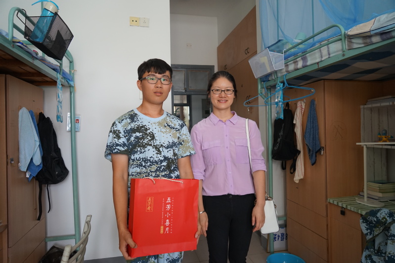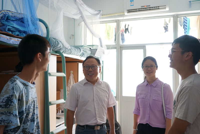 在宿舍里,胡书记和姜书记同新生亲切交谈,关心新生的入学三周大学生活适应情况、身体和心理状况,询问生活设施便利与否,并就学习方面的话题同学生们展开交流。胡书记为同学们悉心讲解大学学习中的注意事项,指导学生们有计划、有重点、有步骤地学习专业课程,通过举例亲身学习经验和方法,为新生自主规划学习和生活指明了方向;姜书记非常关心新生生活适应情况,询问军训训练强度,提醒新生与家人多沟通。两位书记期望学生们以学习为主,同时拓宽视野,开发综合能力,鼓励同学们锻炼身体、保持良好的心态。最后,两位书记为每一间宿舍送上了月饼礼盒以表学院对学生及学生家庭的关怀和诚挚的中秋祝福。