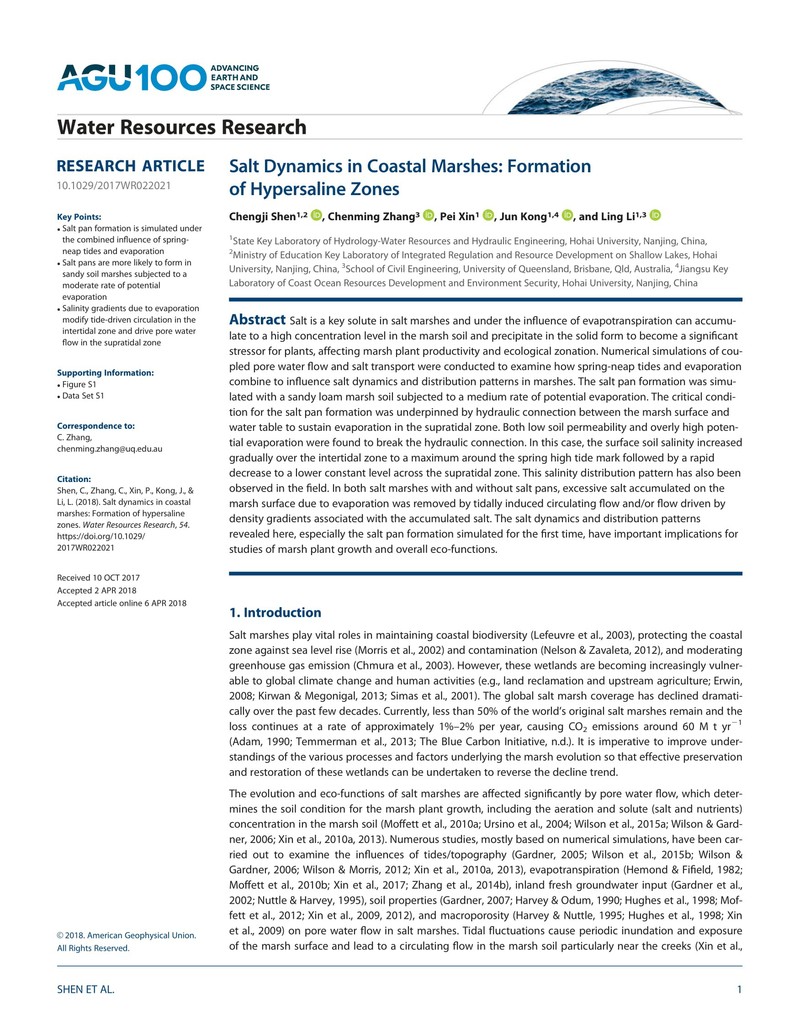 近日,高清av 海防所沈城吉博士、孔俊教授在国际权威期刊 《Water Resources Research》 (一区TOP,影响因子4.397)发表题为“Salt Dynamics in Coastal Marshes: Formation of Hypersaline Zones”的学术论文。