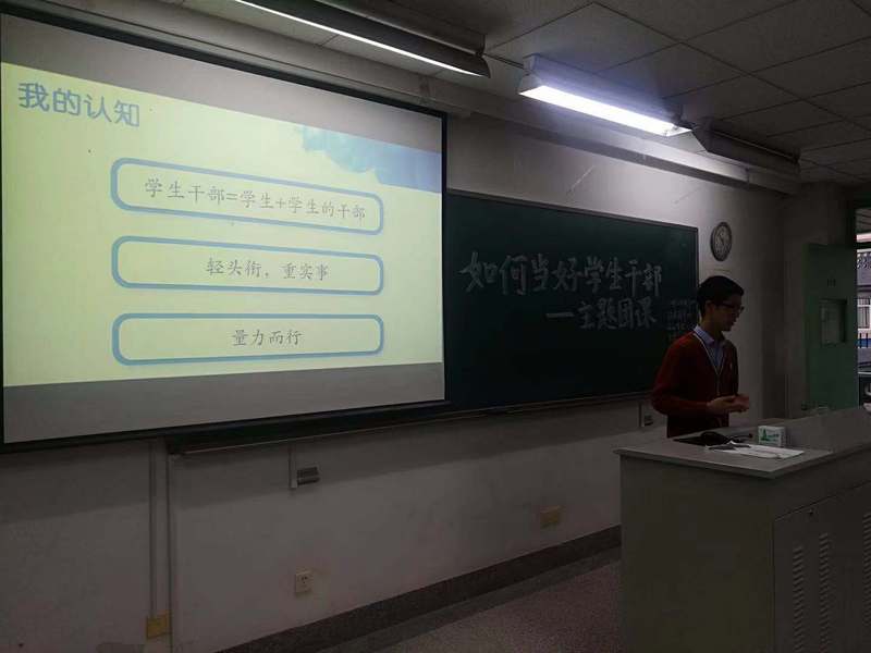 接下来是李澳新学姐,她用以“身为风帆”为题的PPT向班委们分享自己的经验。她明确了班委作为服务者的身份,告诫班委们一定不能存有位高于人之心。并以自己为例,指出学习成绩对于干部的重要性以及学会换角度思考的必要性。最后她提出了三个值得思考的问题:我有什么、我缺什么、我要什么,并借亮剑精神作了形象的诠释,引发了同学们的思考。