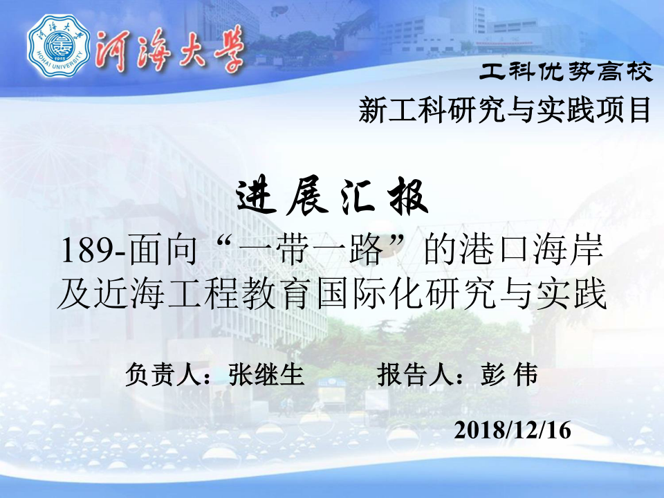 12月16日,在天津大学举行了工科优势高校新工科研究与实践项目年度进展交流会,高清av 张继生教授负责的#189课题——“面向“一带一路”的港口海岸及近海工程教育国际化研究与实践”进行了汇报。本次会议由教育部高等教育司、教育部高等教育教学评估中心指导,教育部新工科研究与实践专家组主办,天津大学承办,旨在全面贯彻全国教育大会精神,落实新时代全国高等学校本科教育工作会议要求,扎实推进新工科工作建设实施。