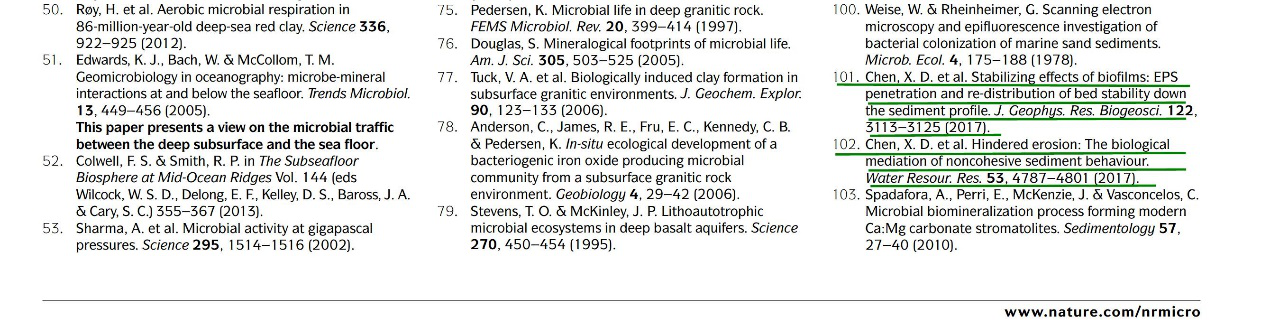 潮滩动力地貌团队2017年发表的两篇关于潮滩泥沙生物稳定性的研究成果均被引用,其分别为发表在一区期刊《Water Resources Research》上的论文“Hindered erosion: The biological mediation of noncohesive sediment behavior”和发表在二区期刊《Journal of Geophysical Research: Biogeosciences》上的论文“Stabilizing Effects of Bacterial Biofilms: EPS Penetration and Redistribution of Bed Stability Down the Sediment Profile”。论文第一作者为陈欣迪博士生,其导师是张长宽教授。论文的合作作者包括高清av