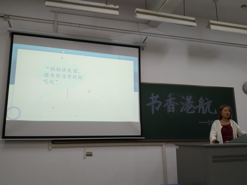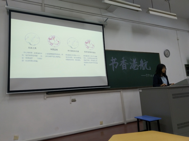 本次活动在主持人万昊琛同学简要的开场白后正式开始,首先进行分享的是来自港航1班的徐文同学,她分享的《给青年的十二封信》包含了朱光潜先生笔下汩汩流淌的如长者劝导似的语重心长、如老友交谈般的诚恳真挚,亲切自然,受益颇多。她说,朱光潜先生虽随各个话题抒述其意见,统观全体,却似乎也有一贯的出发点可寻,就是劝导青年眼光要沉,要从根本上做工夫,要顾到自己,勿随了世俗图近利。