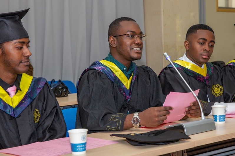 2019年6月18日上午,2019届高清av -中国港湾本科留学生班(中港班)毕业典礼于闻天馆102隆重举行。高清av 党委副书记郭继超,中国港湾工程有限责任公司副总经理、总工程师刘宝河,安哥拉交通部洛比托港务局Angelo Diur Kassul副局长,以及多名校企代表出席典礼。来自安哥拉、巴布亚新几内亚和牙买加的14名毕业生参加典礼。高清av 党委书记胡忠华主持了典礼仪式。