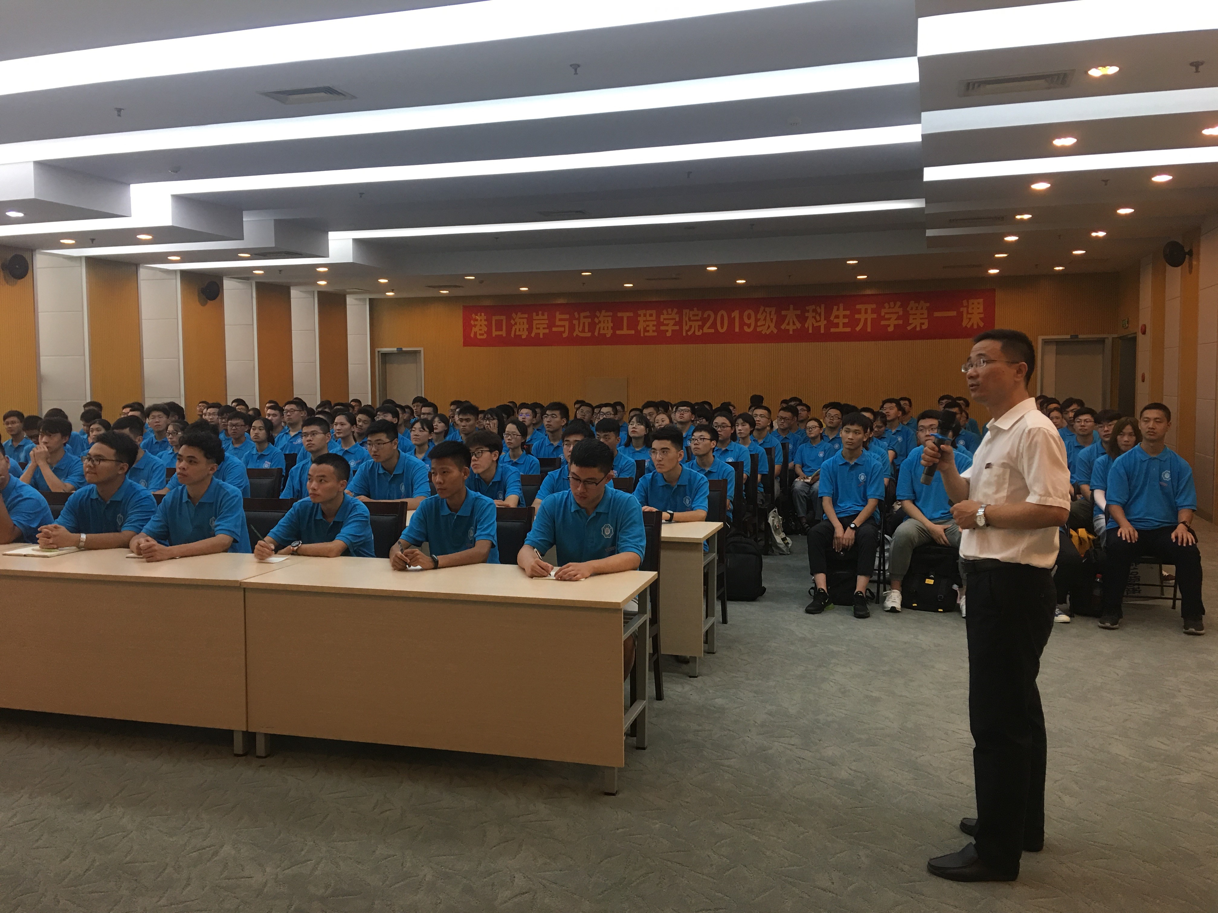 典礼结束后,龚政院长以“港航海资,携手前行”为主题给2019级本科新生讲授开学第一课。他以“河海”、“水利”、“港航”、“海资”四个关键词为引言,从发展历程、发展现状和卓越贡献三方面简略介绍了高清av ,从发展历程、师资队伍、学科专业和教学教育四个方面介绍了高清av ,并以港口工程、航道工程和海岸工程三个板块阐述了港口航道与海岸工程和海洋资源开发技术两个专业的精髓所在,同时他用“舟楫之便,向海而兴”八个字强调了两个专业的意义与优势所在。在龚政院长细致的介绍下,新生们初步了解了高清av 的发展历史和专业发展趋势,并就军港建设和科研两个方面提出了疑问,龚院长为此一一解答。