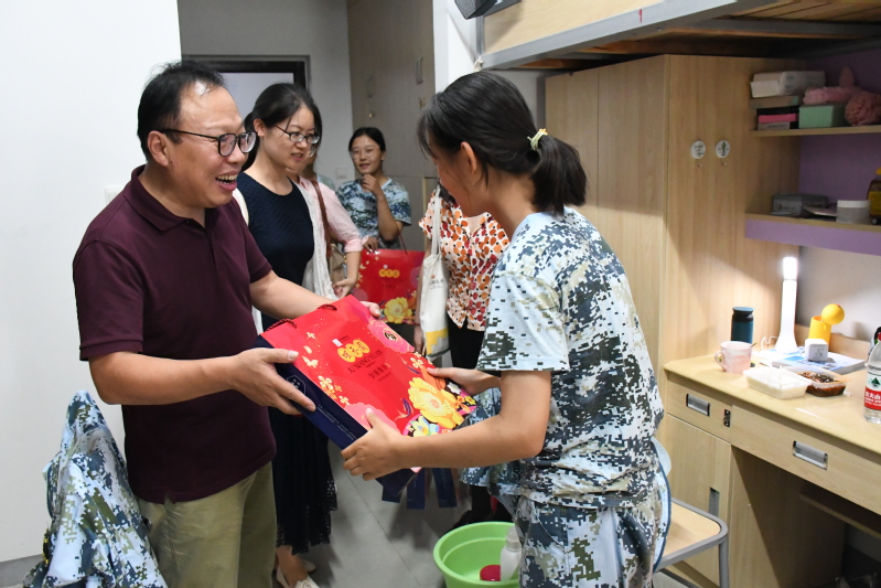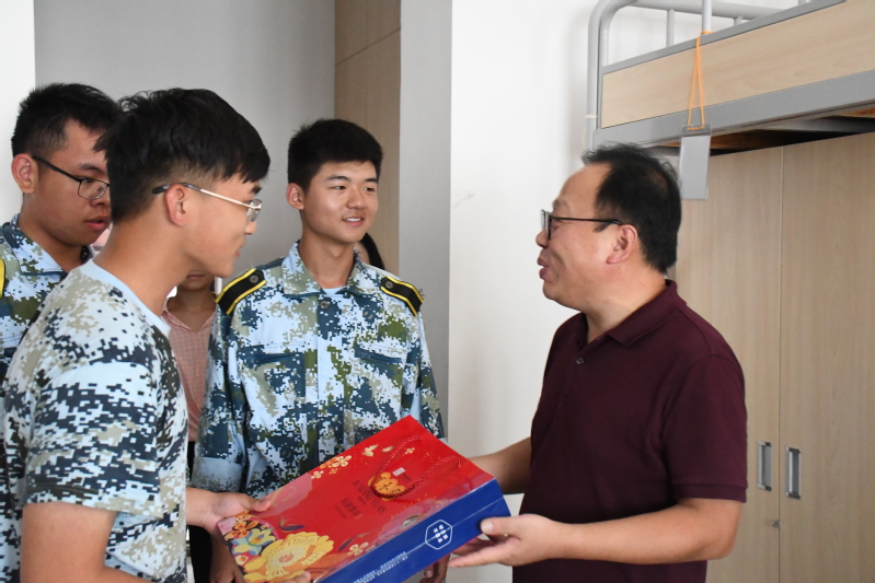 2019年9月12日,高清av 党委书记胡忠华、副书记姜海霞在2018级辅导员顾钰恒、2019级辅导员廖芳艺陪同下来到江宁校区教学区23舍和24舍,亲切慰问了军训中的2019级新生并赠送了学院精心准备的月饼,为新生们带来了中秋祝福。