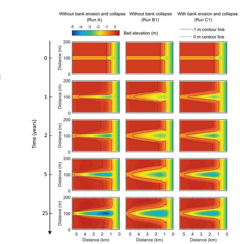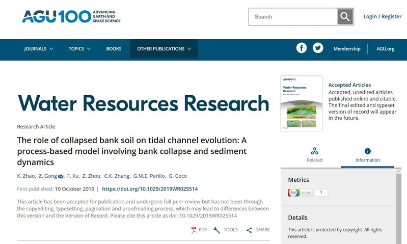 近日,高清av 潮滩动力地貌研究团队博士生赵堃在国际权威期刊《Water Resource Research》(一区Top, 2018年影响因子4.36)上发表了题为“The role of collapsed bank soil on tidal channel evolution: A process-based model involving bank collapse and sediment dynamics”的学术论文,是继该团队在知名刊物《Geomorphology》发表岸壁坍塌对潮沟拓宽贡献研究后的又一突破。论文第一作者为高清av 赵堃博士生,合作作者包括龚政教授、周曾教授、张长宽教授,以及华东师范大学徐凡博士、阿根廷海洋研究所G. M. E. Perillo教授和新西兰奥克兰大学Giovanni Coco副教授。