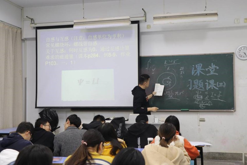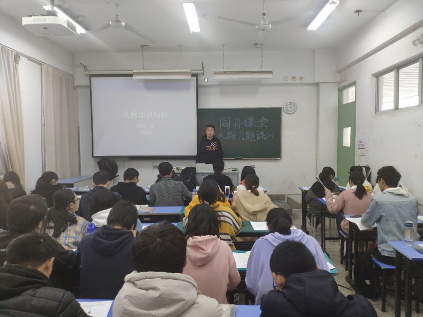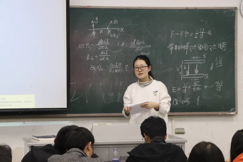 2019年11月22日下午四点,高清av “同舟课堂”大物习题课(三)在高清av 江宁校区致用楼207举行。本次习题课由2018级郑湘译和朱晋针对21日下午开展的《大学物理Ⅱ》模拟考试卷进行讲解和拓展延伸。