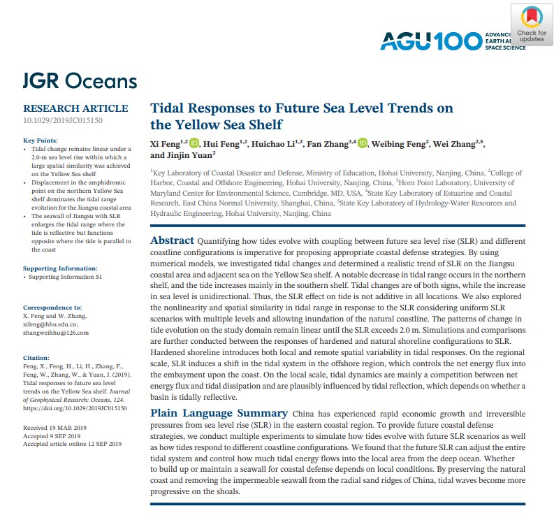 近日,隶属海岸灾害及防护教育部重点实验室(高清av ),(Key Laboratory of Coastal Disaster and Defence (Hohai University), Ministry of Education)的冯曦老师携研究生冯辉、李慧超等在国际学术TOP期刊《Journal of Geophysical Research: Oceans》上发表高质量研究论文“Tidal responses to future sea level trends on the Yellow Sea shelf”。该论文阐明了复杂海岸带环境下,海平面上升与潮能演化之间的动态规律,首次界定了在中国特有的开放式海岸条件下,近岸潮能演变规律由线性形态到非线性形态的零界位置。同时,指出了在刚性和柔性护岸不同条件下,黄海大陆架近岸潮能应对海平面上升的自适性。该论文反映了平行岸线的前进潮波与垂直岸线的类驻波潮波与不同护岸之间的组合关系;从运动机制与动力机制两方面分别揭示了柔性护岸与刚性护岸工程对近未来(100年间)潮能发展的状态。该成果不仅具有重要的理论意义,而且对目前我国的生态护岸工程也有广泛的现实借鉴作用。