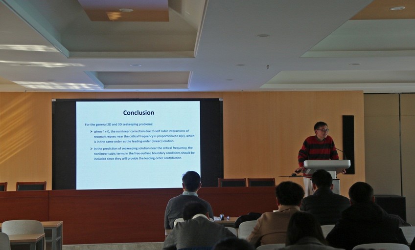 美国麻省理工学院机械工程系海洋工程研究中心刘玉明教授作了题为“Seakeeping Solution Behavior near the Critical Frequency(临近频率附近的船舶耐波性研究)”的学术报告。刘教授结合自己研究课题介绍了需要使用非线性方法求解水动力问题的原因,对使用的数学方法、边界条件给予了详细的讲解。并且,利用该方法对完全淹没的圆柱和临界频率附件的船舶运动情况进行了展示。