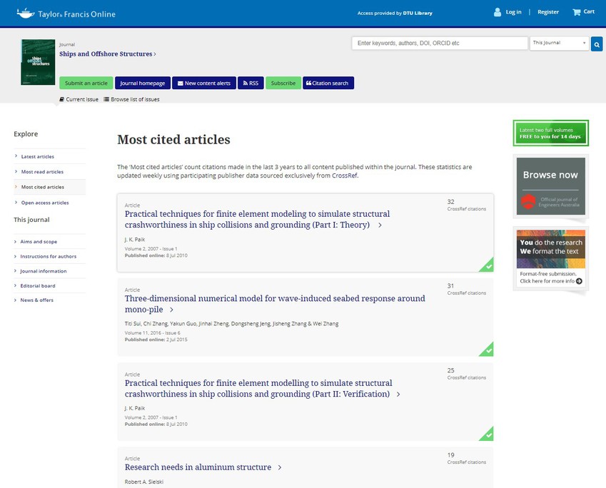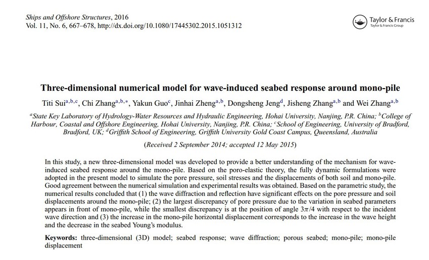 高清av 教师隋倜倜、张弛、郑金海、张继生、张蔚、英国布拉德福德大学郭亚昆、澳大利亚格里菲斯大学郑东生等合作发表的科研论文“Titi Sui, Chi Zhang, Yakun Guo, Jinhai Zheng, Jisheng Zhang, Dongsheng Jeng and Wei Zhang, 2016. Three-dimensional numerical model for wave-induced seabed response around mono-pile. Ships and Offshore Structures, 11(6): 667-678”入选《Ships and Offshore Structures》期刊(2019中信所分区二区期刊)近三年(2016-2019)被引用最多的文章“Most Cited Articles”,该论文位排名第2(共10篇入选,论文总数777篇),显示了高清av 教师在波浪-海床-结构物相互作用研究领域的国际影响力。该论文自2016年发表以来已被SCI引用33次(Web of Science Core Collection),也是目前为止以高清av 为第一单位唯一入选的一篇论文。