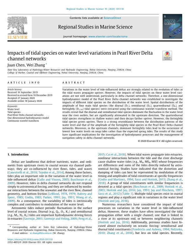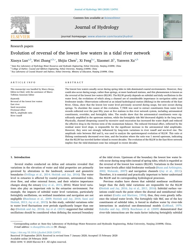 近日,高清av 二年级硕士研究生罗小雅和陈娟分别在国际权威期刊“Journal of Hydrology”(影响因子:4.405)和“Regional Studies in Marine Science”(影响因子:1.462)以第一作者发表高水平论文“Evolution of reversal of the lowest low waters in a tidal river network”和“Impacts of tidal species on water level variations in Pearl River Delta channel networks”。