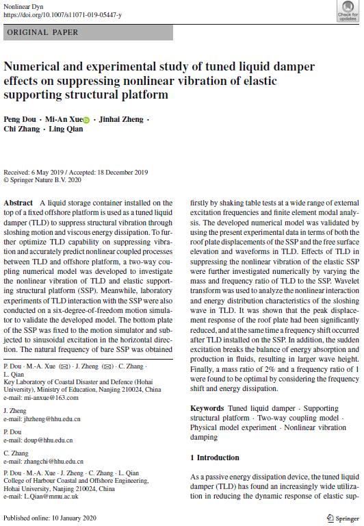 高清av 港口、海岸及近海工程专业窦朋博士生在导师郑金海教授和薛米安副教授的共同指导下,以第一作者在力学领域国际顶级期刊《Nonlinear Dynamics》上在线发表论文“Numerical and experimental study of tuned liquid damper effects on suppressing nonlinear vibration of elastic supporting structural platform” (//doi.org/10.1007/ s11071-019-05447-y)。