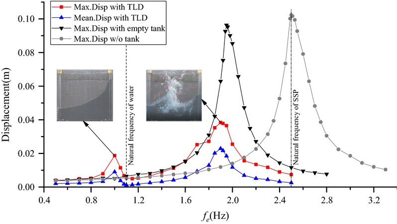 在高清av 六自由度液舱晃荡振动台上,建立调谐液体阻尼器与弹性支撑结构海洋平台双向流固耦合作用的物理试验模型,利用激光位移传感器构建了上部平台位移响应的高精度非接触式测量系统。基于ANSYS Workbench研发界面耦合算法,建立三维数值仿真模型,模型中流固耦合边界定义在流体压力及结构变形发生的水箱内壁,流体解和固体解仅在此界面进行数据交换,不仅大大提高了计算效率,而且有效地节约了计算机内存。在此基础上,探明了耦合系统动态响应过程中,调谐液体阻尼器内部的晃荡波面形态(Fig. 1)与其阻尼性能之间的关联机制、耦合模型上部平台位移衰减率、能量耗散率及水箱内晃荡波面的谱峰频率对流体与固体之间的质量比、调谐频率比(Table 1)等关键参数的依赖关系,提出了基于耦合试验模型的最优减振质量比及频率调谐比参数,阐明了调谐液体阻尼器对结构平台吸能和调频为主的振动控制机制(Fig. 2),为其在原型海洋平台等结构减振领域的设计及应用提供科学依据。