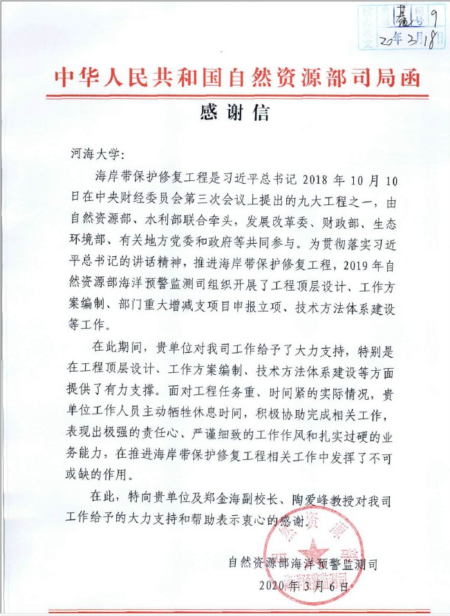 近日,自然资源部海洋预警监测司给我校发来感谢信,对高清av 郑金海教授和陶爱峰教授等多位教师在推进海岸带保护修复工程中的有关工作表示衷心的感谢。