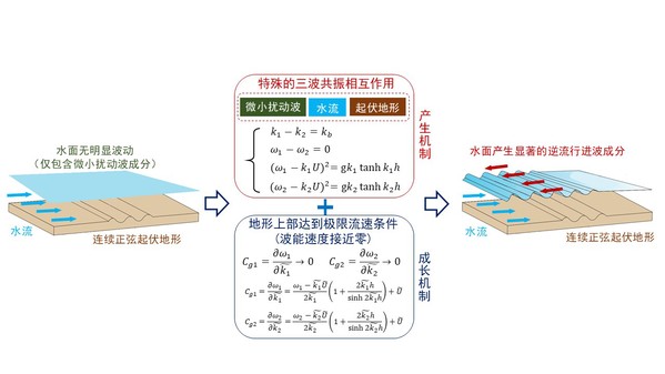 | 连续沙波地形上的波流相互作用机理 设计开展了147组波流水槽试验,应用多重尺度摄动解析,发现在相对水深0.6~1.0和弗罗德数0.24~0.31的范围内,亚临界水流经过连续沙波地形时会激发逆流行进波这一自然现象,阐明逆流行进波的波形产生与成长机制是基于沙波和波相位逆流传播的两个波组成的三波共振组合与地形上部水流流速接近共振波的极限流速条件的联合作用。