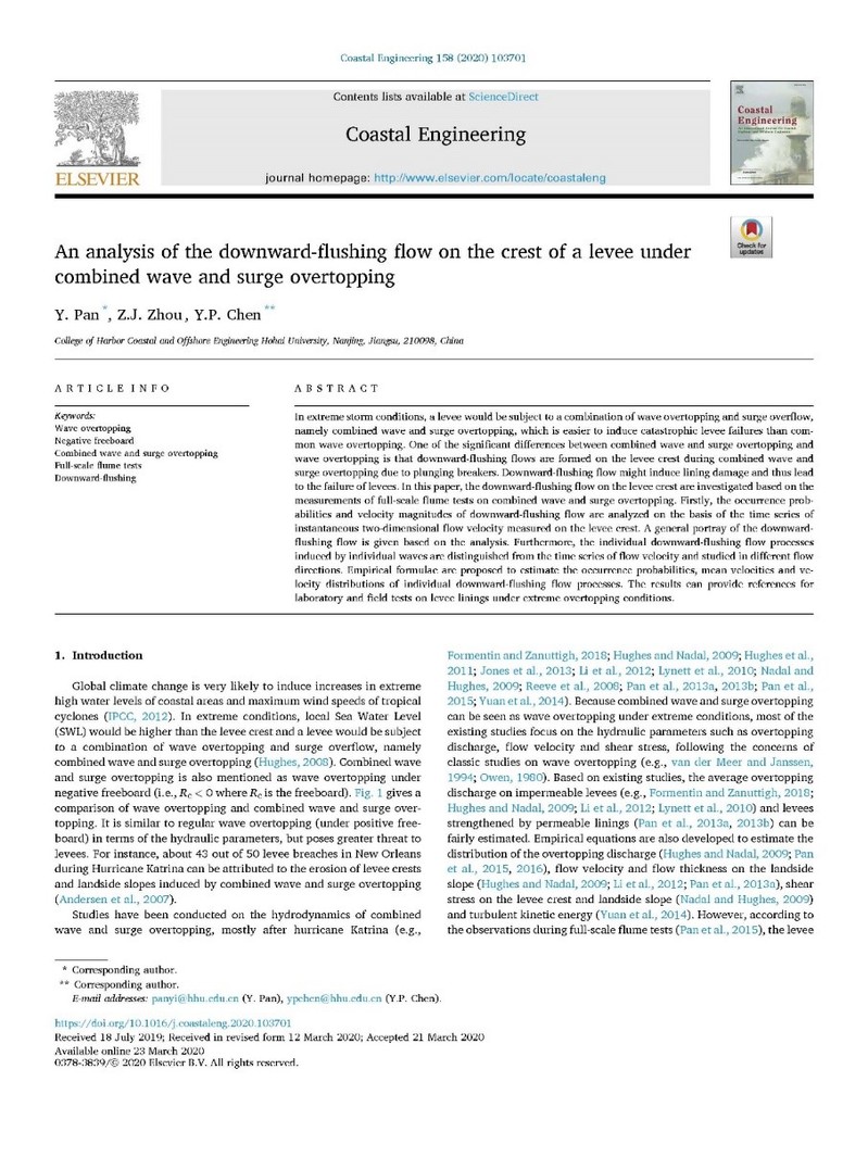 近日,高清av 教师潘毅、陈永平和博士生周子骏在中信所一区,海岸工程类排名第一的行业Top期刊《Coastal Engineering》上发表高质量学术论文:“An analysis of the downward-flushing flow on the crest of a levee under combined wave and surge overtopping”。