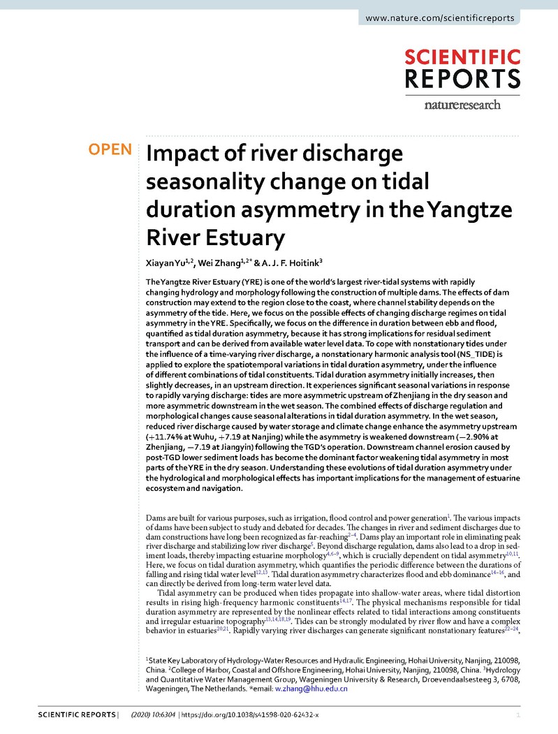 近日,高清av 三年级硕士研究郁夏琰和指导教师张蔚教授(通讯作者),与Journal of Geophysical Research(JGR)-Earth Surface主编Hoitink教授合作,在Nature旗下期刊《Scientific Reports》发表高水平论文 “Impact of river discharge seasonality change on tidal duration asymmetry in the Yangtze River Estuary”。研究课题得到了国家重点研发计划项目“长江口水沙变化与重大工程安全(2017YFC0405400)”的资助。