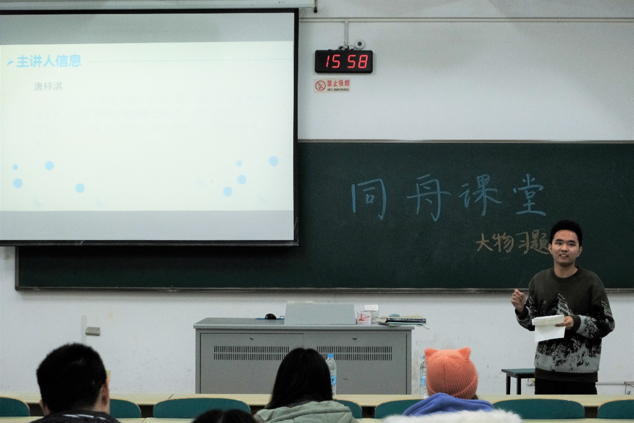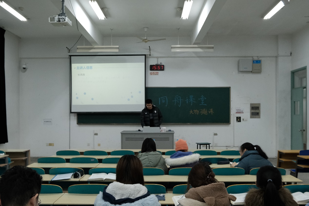 2020年12月8日,高清av “同舟课堂”之大学物理习题课在江宁校区致高楼B104顺利举行。本次活动的主讲人是高清av 2019级唐梓淇和杜雨昂两位同学,他们分别就恒定磁场和电磁感应的一系列问题向同学们做了详细的解说。