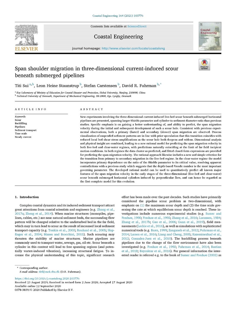 近日,高清av 教师隋倜倜在海底管道冲刷领域取得进展,与丹麦科技大学海岸工程团队合作研究成果在一区期刊《Coastal Engineering》上发表,标题为“Span shoulder migration in three-dimensional current-induced scour around submarine pipelines”。