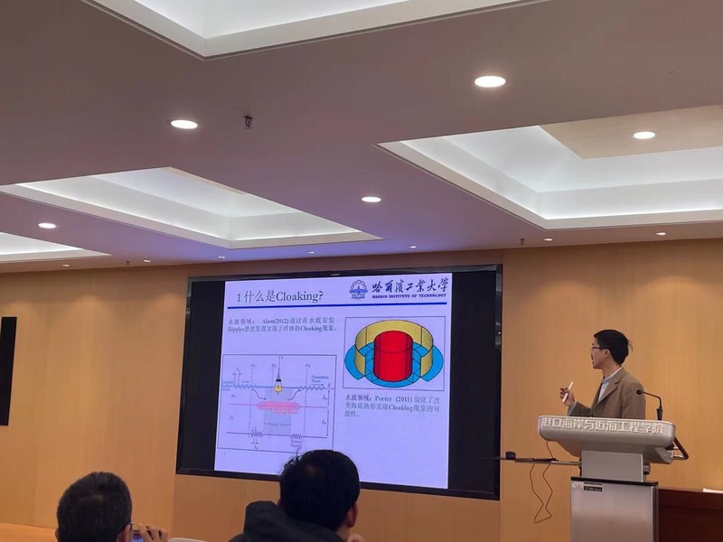 何广华教授作了题为“船海工程水动力数值模拟及应用”的学术报告,报告详细介绍了何广华教授课题组十几年来的代表性科研成果,包括船舶航行运动模拟,电平台设计,海上移动浮岛设计,强风浪中舰船的强非线性上浪、砰击预警系统开发和通气空泡的数值研究等。会后,何广华教授和与会师生就Cloaking现象影响因素的数值分析及其应用前景展开了讨论与交流。