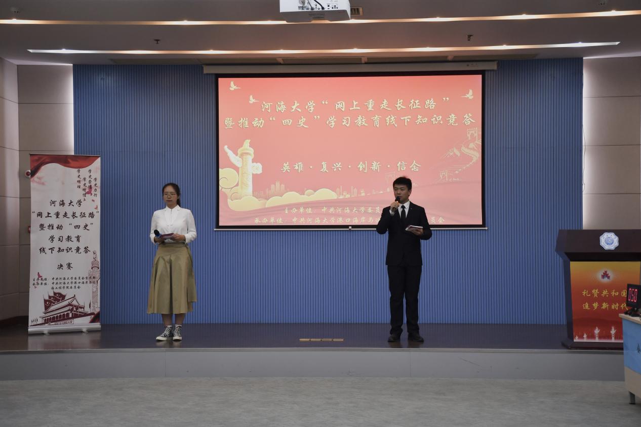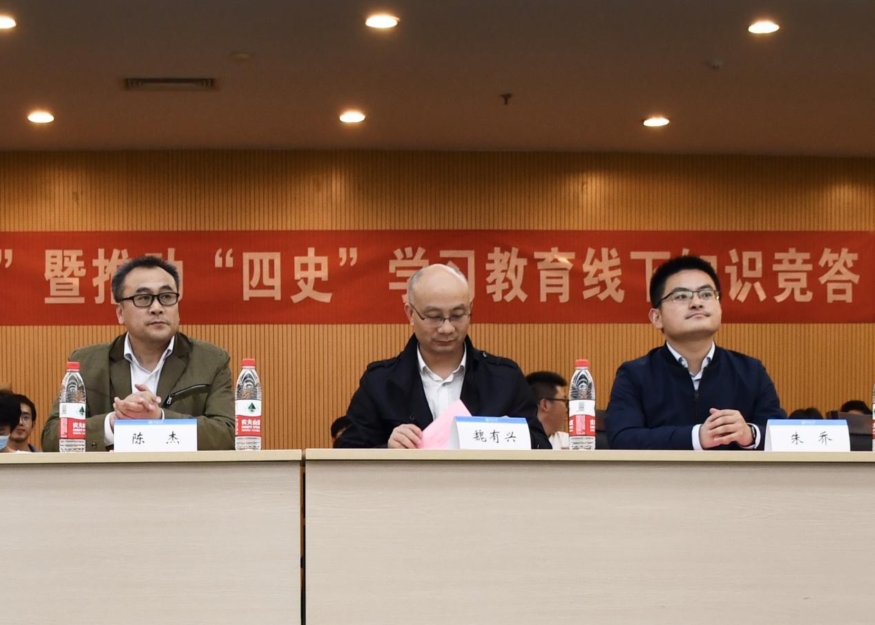 4月23日,高清av “四史”学习教育知识竞答活动决赛在江宁校区图书馆401顺利举行,校党委宣传部常务副部长魏有兴、党委研工部部长陈杰、团委副书记朱乔、党委学工部副部长汤鸣鸿、马克思主义学院黄世虎、高清av 党委副书记沈国军、党委宣传部思想教育科科长刘金凤、高清av 辅导员廖芳艺出席活动。