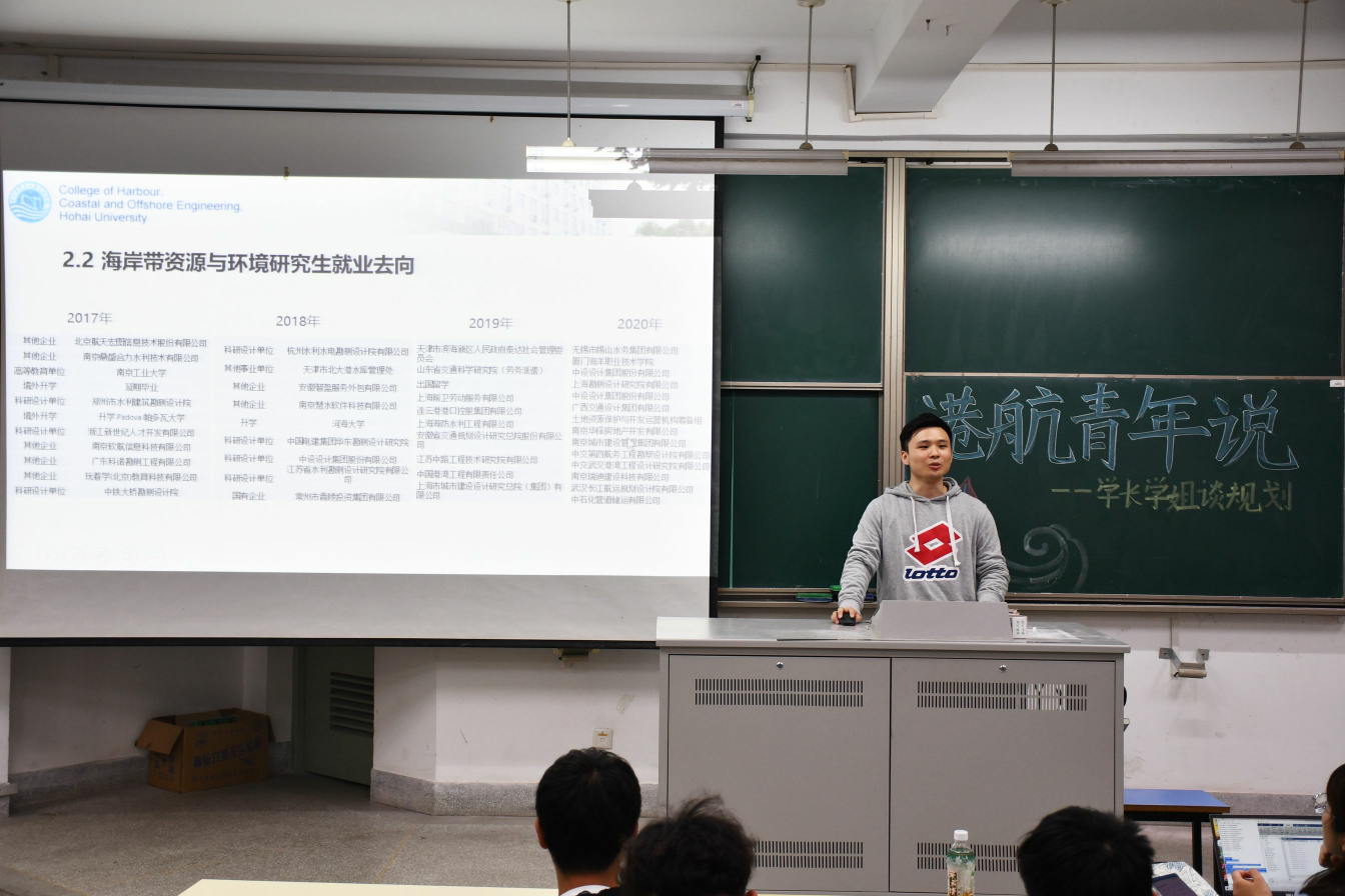 王博文向同学们介绍了港航、海资专业对口的工作单位以及这些工作单位的用人标准,告诉大家要多参加工作实习,选择适合自己的工作,让大家对工作单位的选择有了一定的了解。