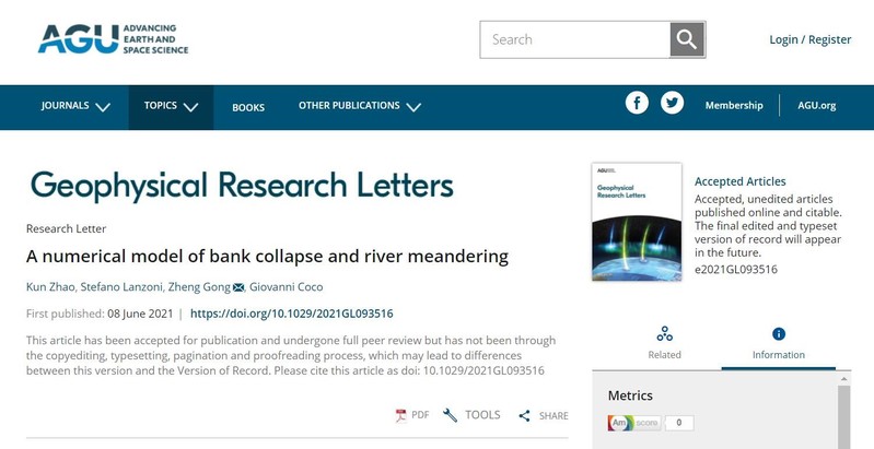 高清av 潮滩动力地貌研究团队博士生赵堃在龚政教授主持的国家杰出青年科学基金项目“海岸动力地貌学:多因子驱动下潮滩系统演变机制研究”支持下,在地貌学权威期刊《Geophysical Research Letters》(一区Top)上发表了题为“A numerical model of bank collapse and river meandering”的研究论文,是该团队在知名刊物《Geomorphology》、《Water Resource Research》和《Journal of Geophysical Research: Earth Surface》发表崩岸相关研究的第四篇系列文章。论文第一作者为高清av 赵堃博士生,通讯作者为龚政教授,合作作者为意大利帕多瓦大学Stefano Lanzoni 教授和新西兰奥克兰大学Giovanni Coco副教授。