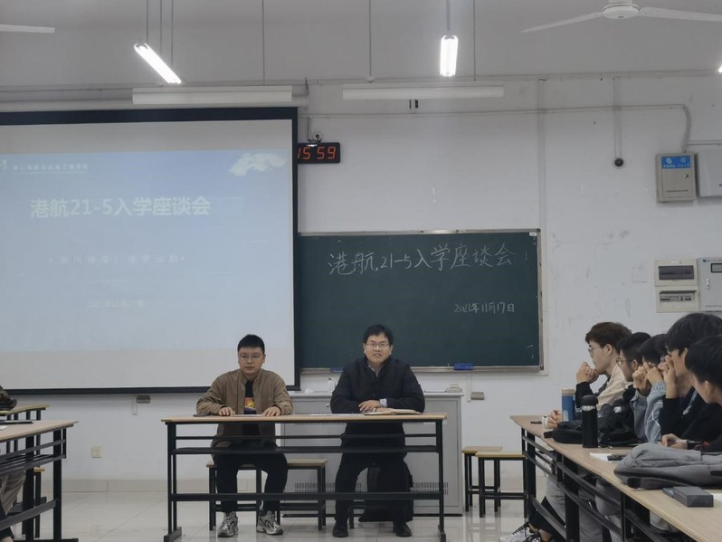 2021年11月17日,高清av 副院长张继生教授于江宁校区博学楼B204,与2021级港航5班全体同学进行入学适应座谈,2021级辅导员王恒星老师出席。本次座谈会意在了解新生入学以来的思想学习生活状况,了解并解决同学们对于大学生活、专业课学习与认知、时间分配、职业生涯规划等的问题。