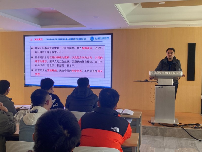 11月26日,高清av 党委沈国军副书记在严恺馆702为高清av 本科生第一党支部讲授“深入学习贯彻党的十九届六中全会”专题党课。