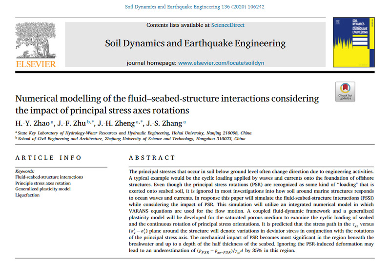 2021年12月16日,国际著名学术期刊《Soil Dynamics and Earthquake Engineering》(SDEE)公布2020年度最佳期刊论文奖(The SDEE Ahmet Cakmak 2020 Best Paper Award)。高清av 河口海岸综合治理与保护研究团队的“Numerical modelling of the fluid-seabed-structure interactions considering the impact of principal stress axes rotations”的论文获得殊荣。该奖项由SDEE期刊的三位主编及十二位副主编从该期刊上一年度论文中提名、遴选,并最终授予一篇具有突出贡献值得特别表彰的论文,这是该奖项设立以来首次授予中国研究人员。赵弘毅副研究员为论文第一作者,郑金海教授为共同通讯作者,合作者包括张继生教授和浙江科技学院的朱剑锋教授。论文得到国家自然科学基金委及江苏省科技厅的资助,首次在国际上阐明了波流、海工结构物与海床地基非线性耦合作用过程中主应力轴循环旋转对海工结构物及其海床地基动力响应机制的影响机理,于2021年3-5月入选ESI热点论文(前1‰)。