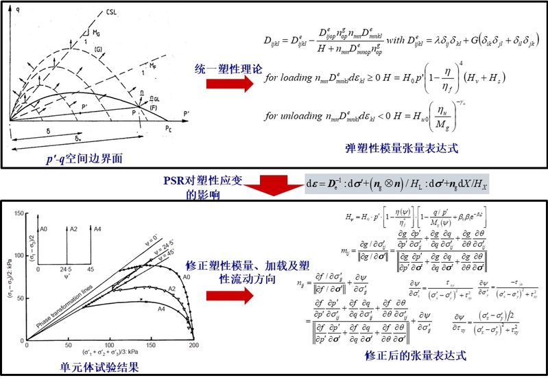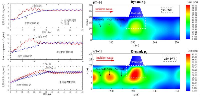 波浪循环荷载作用下海床土单元应力状态的一个主要特征是主应力轴的连续旋转(Principal Stress Rotation 简称PSR),这对土的变形和强度特性产生显著的影响。海工结构物的海床地基通常面临着复杂的初始固结应力状态和循环加载条件,使得主应力轴旋转路径偏离理想状态下的路径。研究团队基于统一塑性理论结合室内土工试验,单独考虑主应力轴旋转产生的塑性应变,并与三个应力不变量产生的塑性应变进行耦合,建立了能描述复杂动力条件下应力主轴旋转效应的高级砂土动力本构模型(图1),并嵌入团队研发的波流-海床-结构物相互作用一体化模型。研究揭示了在波流引起的主应力轴循环旋转影响下海工结构物下方弹塑性海床中土单元应力路径的时空演变规律,考虑PSR影响的一体化模型显著提高了对海工结构物周围海床土体液化的预测精度(图2),克服了弹性或传统弹塑性理论在波流-海床-结构物耦合动力相互作用中模拟精度偏低的局限性,为海工结构物地基设计与维护提供更为可靠的理论依据。