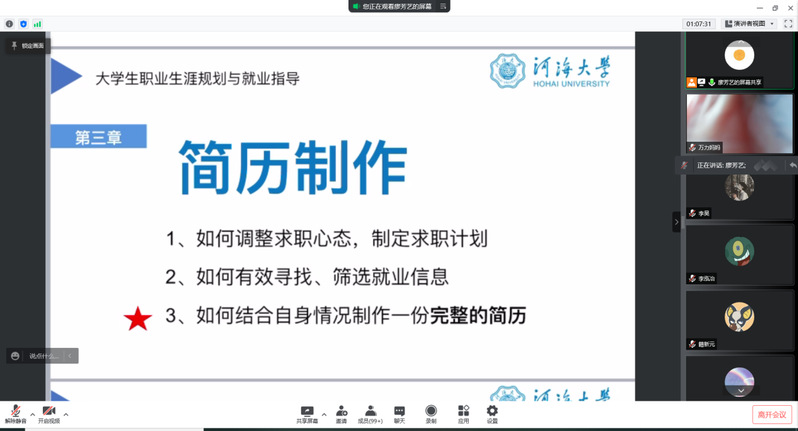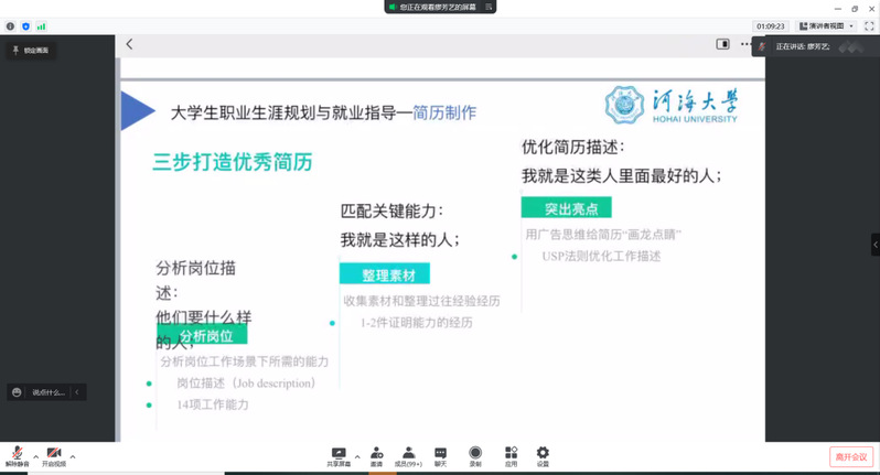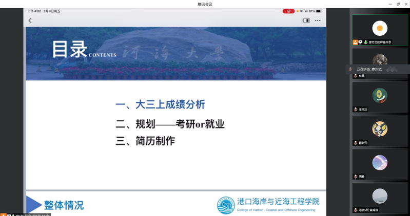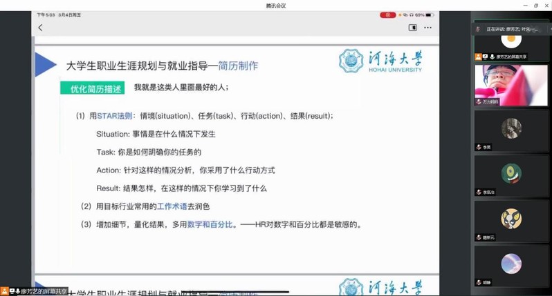 2022年3月4日下午,高清av 2019级在线上开展职业生涯规划和简历制作培训会。大会由2019级本科生辅导员廖芳艺主持,2019级全体学生及家长参加本次大会。廖芳艺老师就年级整体学习情况、大三学年生涯规划、简历制作培训进行分享。