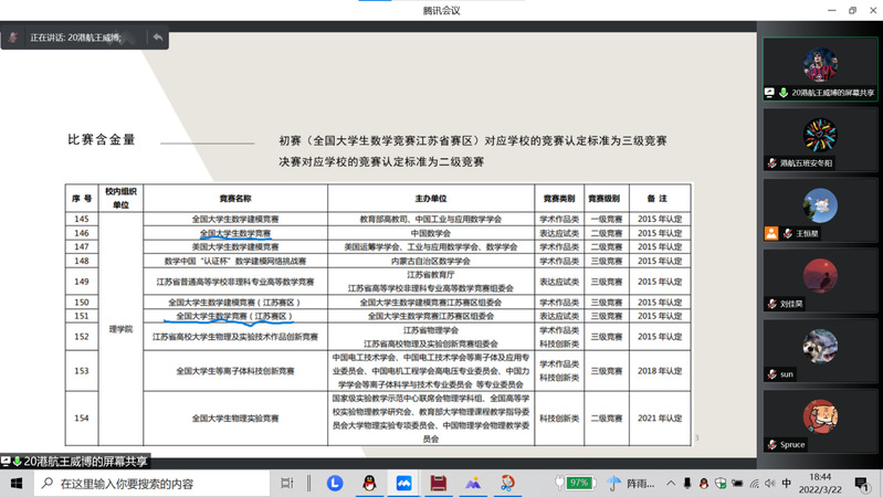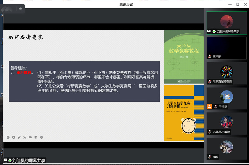 首先,刘佳昊同学主讲江苏省高等数学竞赛备考经验。他从自己对江苏省大学生数学竞赛的学习与备考经验出发,对省赛的竞赛内容、时间、获奖率、竞赛意义等进行了详细的介绍,同时推荐了相关的备考资料,讲解了备考资料的具体使用方法,让21级的同学们对高数竞赛有了初步而全面的认识。