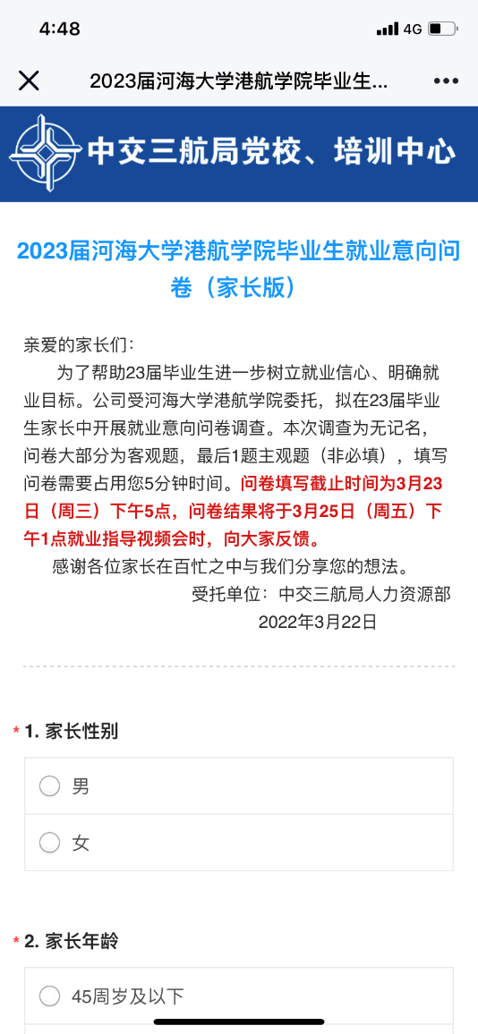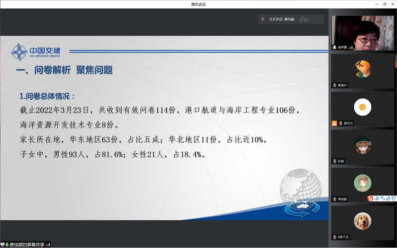 前期,费佳颖老师提前设计针对2019级学生家长的就业调查问卷,并收到114份家长问卷反馈。在讲座中,重点分析了家长对学生在考研、工作、职业倾向等问题的态度、意见并进行了总结。讲座现场,费老师分享了河海校友、中交三航局优秀员工案例,分析关键岗位员工职业发展路径。同时,费老师也分享了中交三航局的岗位职能和暑期实习岗招聘信息,并鼓励学生就业选择要结合自身情况,有的放矢的做足准备,寄语学生“知行合一,付诸行动”。讲座后,2019级学生及家长就工作地域选择、就业单位选择等问题与费老师进行交流。