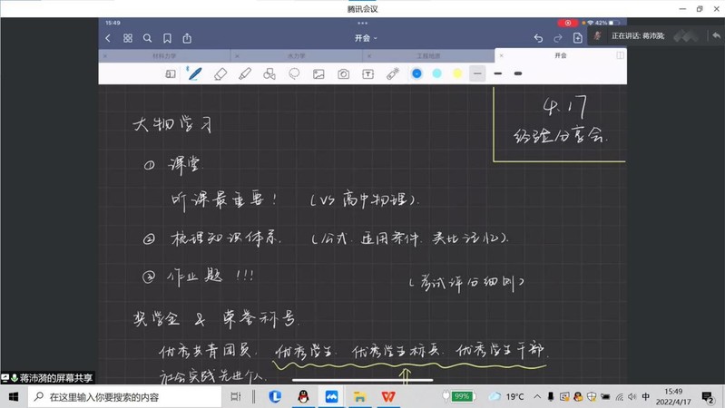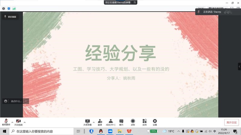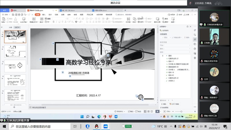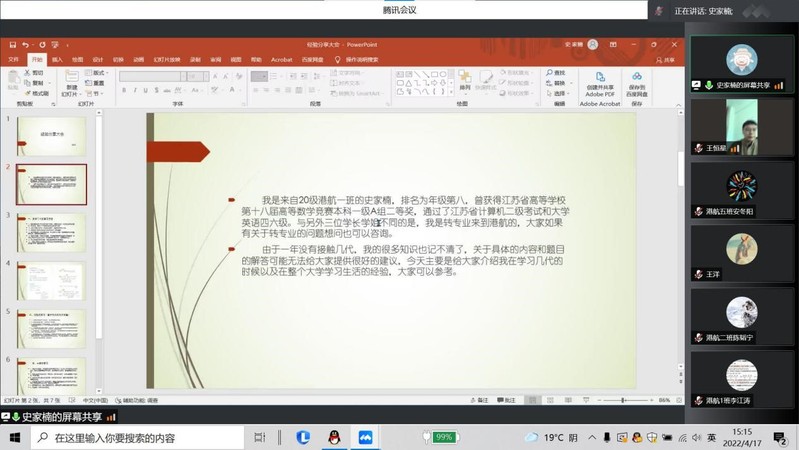 2022年4月17日,高清av 同舟课堂系列讲座第四期——高数、线代、工图、大物经验分享会在线上成功举办。本次活动由高清av 20级的方琳涛、史家楠、姚秋雨、蒋佩漪主讲,他们就自己对于各科特点的理解,分别从高数、线代、工图、大物向21级的学弟学妹们进行了经验分享。高清av 21级辅导员王恒星老师以及高清av 21级同学参与了此次分享会。