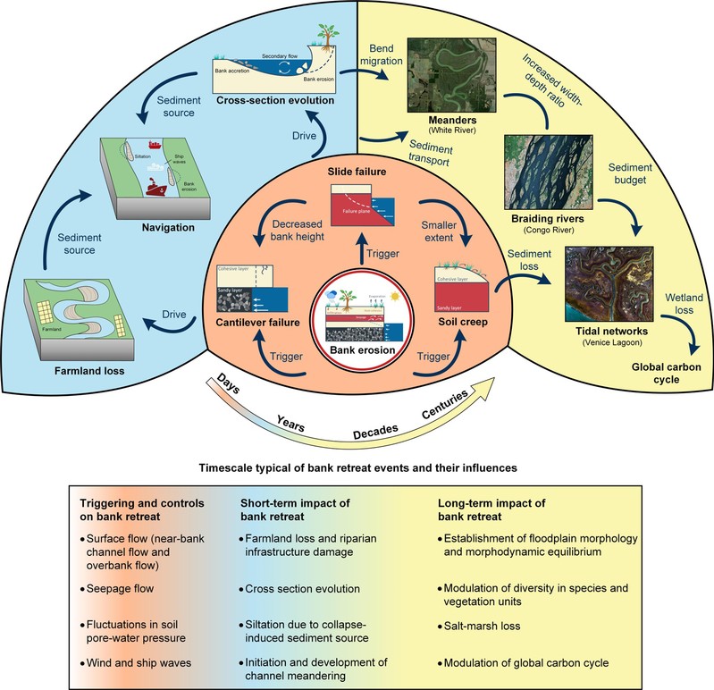 近日,高清av 赵堃博士后撰写的题为“A Review on Bank Retreat: Mechanisms, Observations, and Modelling”的论文被国际顶级期刊Reviews of Geophysics录用。该论文系统介绍了边壁侵蚀后退过程的形成机理及其地貌效应。