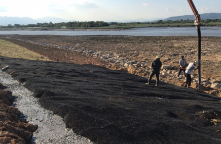 图3 新型生态护坡的工程应用:水土保护毯应用于福州市乌龙江入海口海堤(左),生态混凝土应用于厦门市海堤(右)