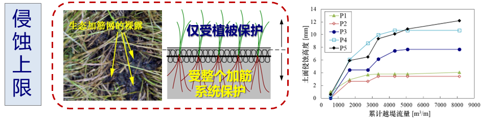 (2)发现了加筋生态护坡水力侵蚀的“侵蚀上限”现象(图2),指出了“侵蚀上限”的数值对容许流速的确定有重要意义;厘清了加筋引起的生态护坡抗剪强度增量与含根量、含筋量之间的关系,提出了特定边坡中最佳根系长度的计算方法;系统阐述了加筋生态护坡对极端越堤水流的抵御机制,丰富了生态海堤的理论体系。